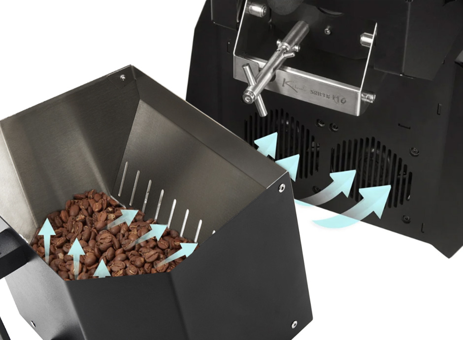 適切な冷却システムは豆の過度の焙煎を防ぎます。 独立型冷却システムが加熱に影響を与えず2~3分で急速冷却します。冷却しながら次の焙煎を行うことができます。